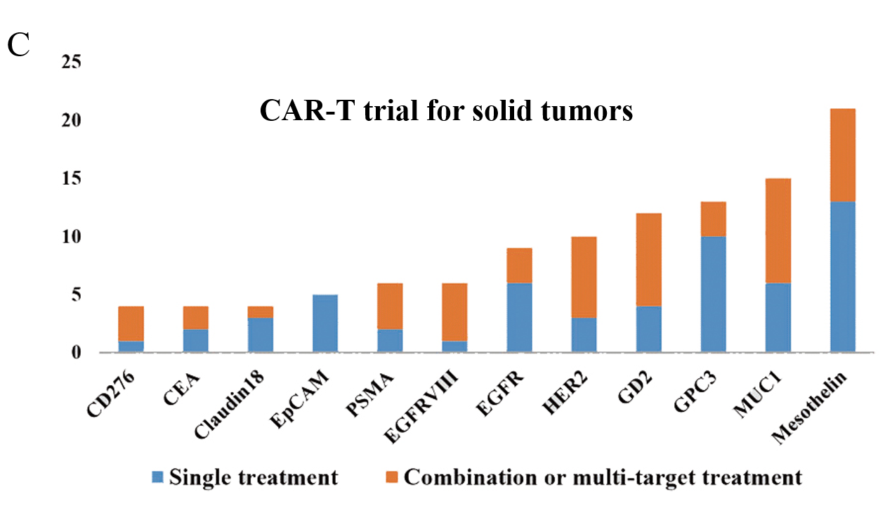 圖1:每年注冊(cè)CAR - T臨床試驗(yàn)數(shù)量的變化和當(dāng)前試驗(yàn)的階段, 以及國(guó)內(nèi)目前 CAR-T 細(xì)胞治療在血液瘤、實(shí)體瘤中注冊(cè)的臨床試驗(yàn)項(xiàng)目數(shù)量[1]