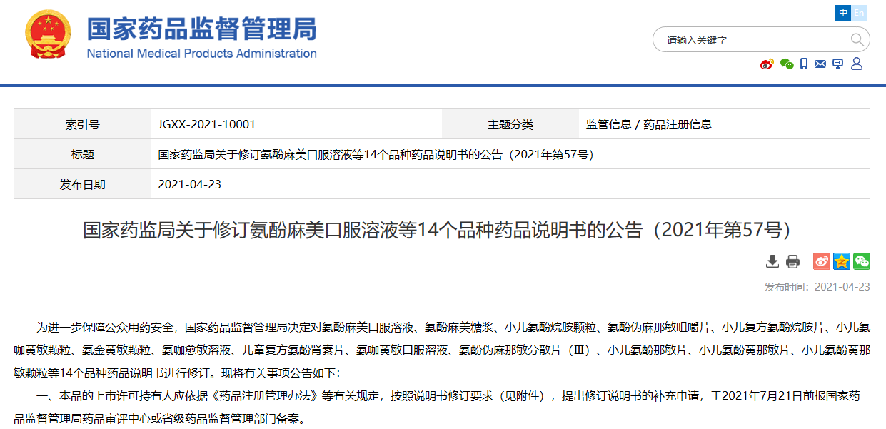 國家藥監(jiān)局關(guān)于修訂氨酚麻美口服溶液等14個品種藥品說明書的公告(2021年第57號)