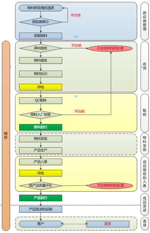 企業(yè)應(yīng)建立書面的管理程序規(guī)定:區(qū)域狀態(tài)標識牌、貨位狀態(tài)標識牌的使用、存放和 管理;貨位狀態(tài)標簽和物料狀態(tài)標簽的接收、發(fā)放、使用和銷毀管理并應(yīng)有記錄。質(zhì)量管理部門負責(zé)建立和實施物料和產(chǎn)品的合格標簽、不合格標簽接收、發(fā)放、使 用、銷毀管理流程,并負責(zé)決定以下質(zhì)量狀態(tài)的轉(zhuǎn)換。