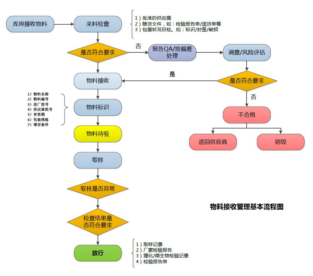 物料接收包括物料從入庫到存放、取樣、檢驗、放行的全過程, 著重說明物料接收的步驟、檢查內(nèi)容和注意事項。