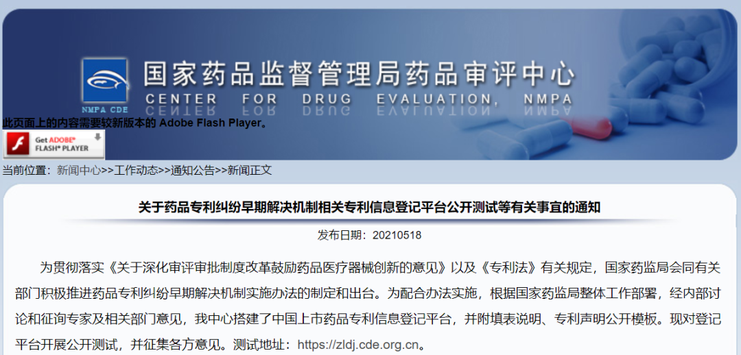 關(guān)于藥品專利糾紛早期解決機(jī)制相關(guān)專利信息登記平臺(tái)公開(kāi)測(cè)試等有關(guān)事宜的通知