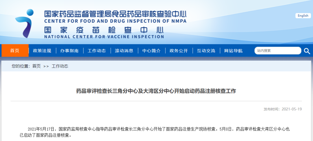 2021年5月17日,國(guó)家藥監(jiān)局核查中心指導(dǎo)藥品審評(píng)檢查長(zhǎng)三角分中心開(kāi)始了首家藥品注冊(cè)生產(chǎn)現(xiàn)場(chǎng)核查。5月8日,藥品審評(píng)檢查大灣區(qū)分中心也已啟動(dòng)了首家藥品注冊(cè)核查。