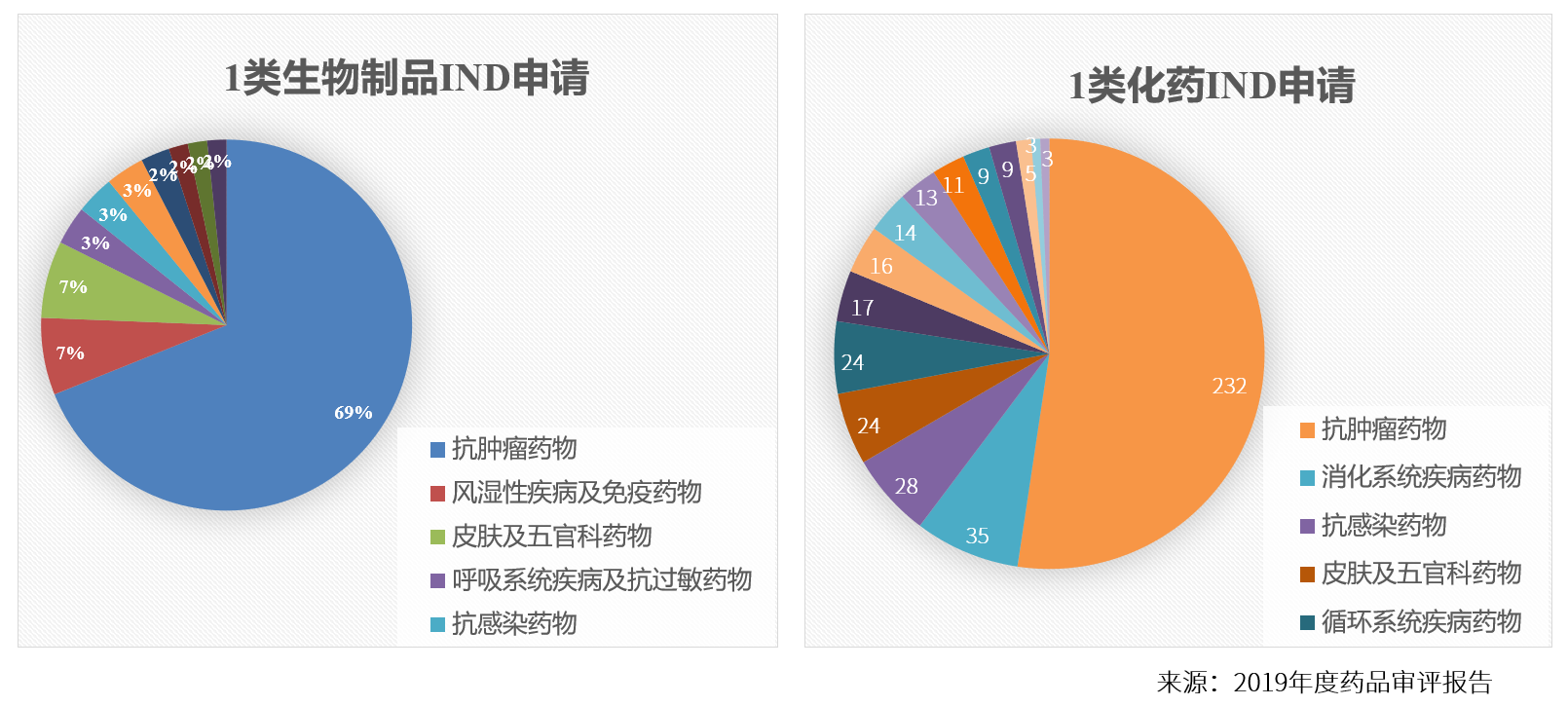 藥審中心受理1類生物制品創(chuàng)新藥注冊申請127件(100個品種),較2018年增長了3.3%。 藥審中心受理1類治療用生物制品IND申請119件(95個品種),適應(yīng)癥主要集中在抗腫瘤治療領(lǐng)域,占全部1類治療用生物制品IND申請的69%,1類化學(xué)藥品IND申請443件。