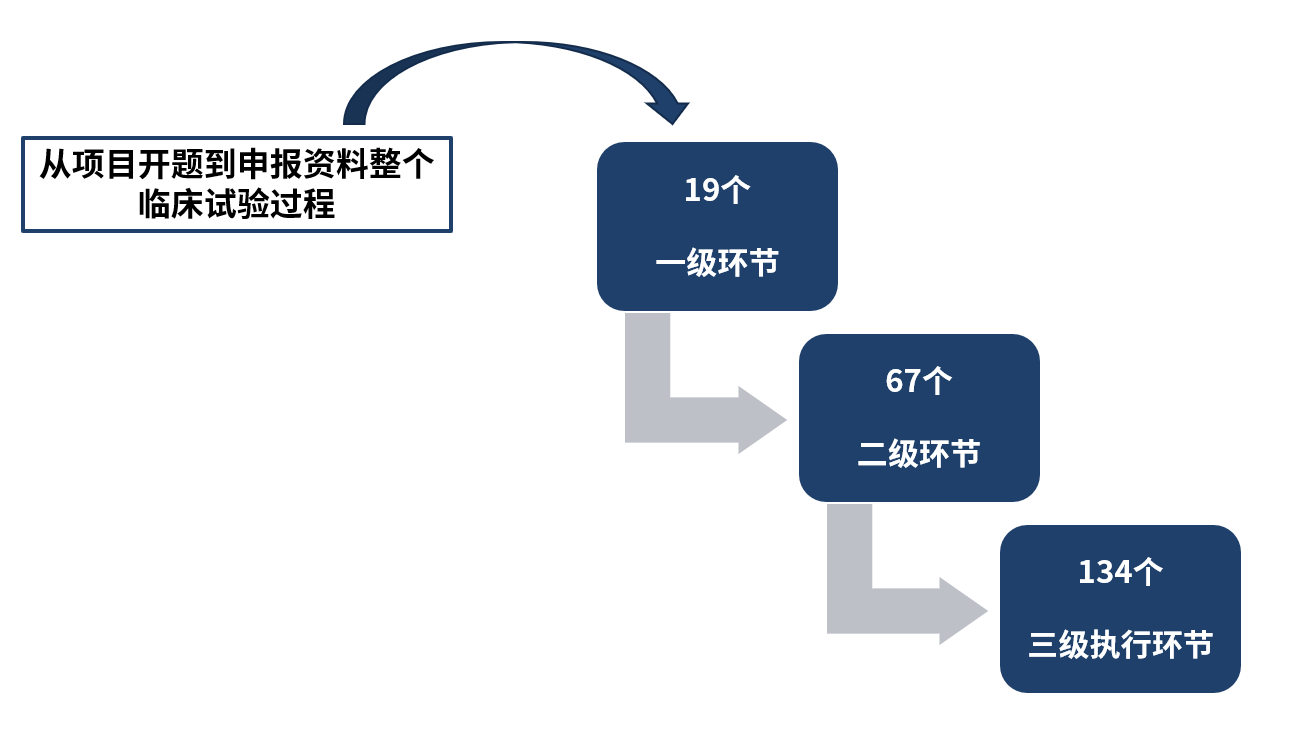 臨床試驗(yàn),從開題、合作方篩選、倫理審查、啟動入組等至最后提交注冊申報資料,共分為: 19個一級環(huán)節(jié); 包含67個二級環(huán)節(jié); 各基于風(fēng)險控制角度,共有134個三級執(zhí)行環(huán)節(jié)。