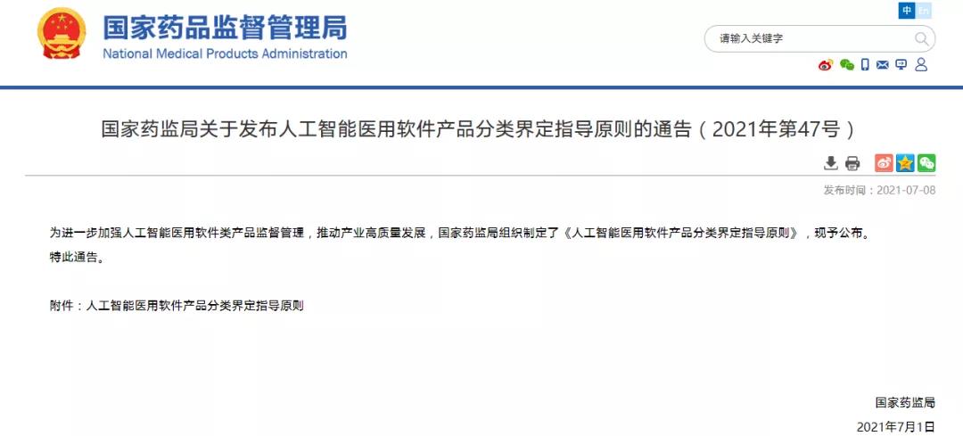 國家藥監(jiān)局關(guān)于發(fā)布人工智能醫(yī)用軟件產(chǎn)品分類界定指導原則的通告(2021年第47號) (2021-07-08)