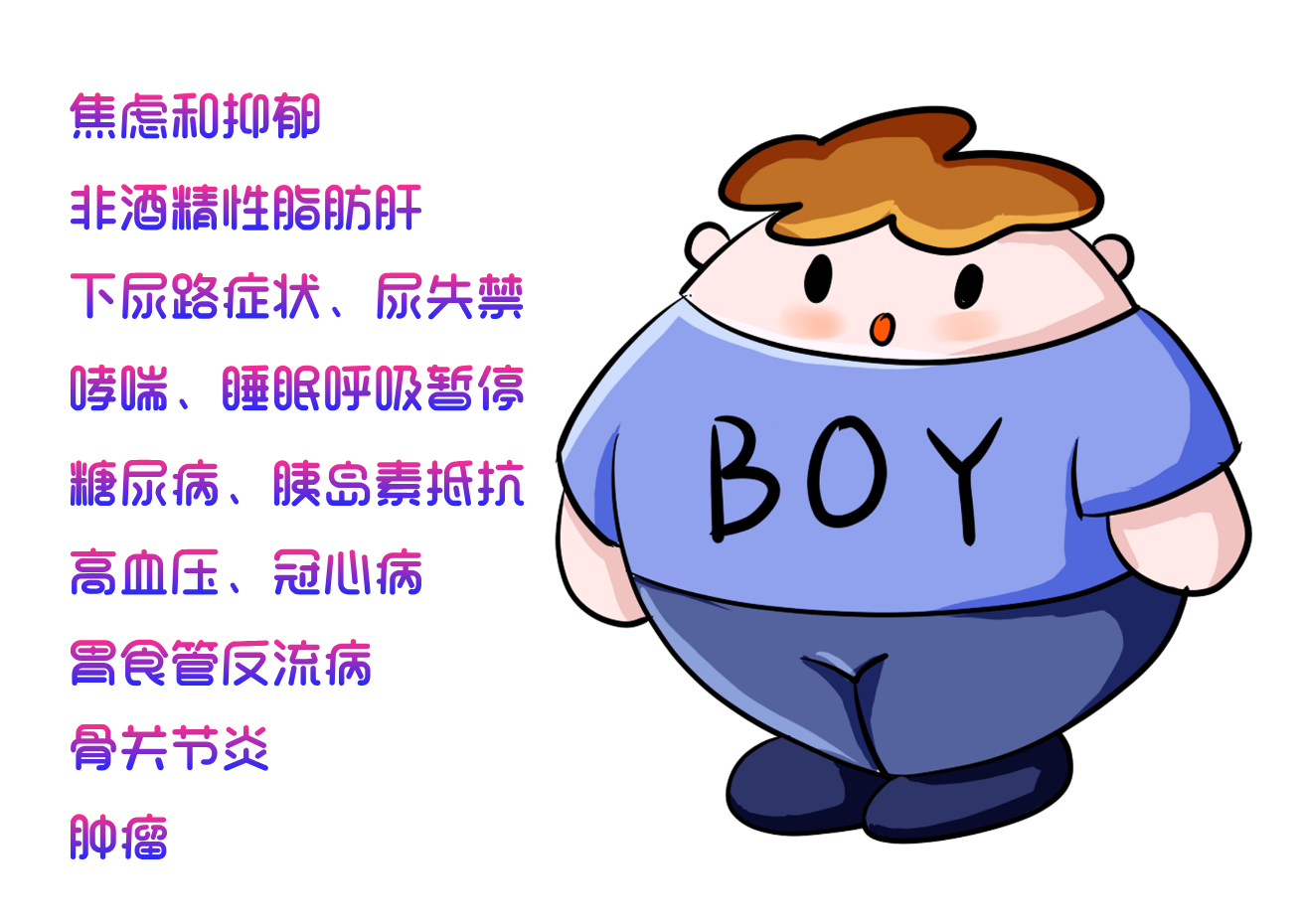 超重和肥胖是一種由多因素引起的以體內(nèi)脂肪過度蓄積為特征的慢性代謝性疾病,其發(fā)病機制包括遺傳、代謝、環(huán)境和行為因素等,除少數(shù)由于疾病導致的肥胖外,絕大多數(shù)的超重和肥胖是能量的攝入超過能量消耗以致體內(nèi)脂肪過多蓄積的結果。超重和肥胖可顯著增加心腦血管、呼吸、內(nèi)分泌、消化、骨骼、生殖及精神等多系統(tǒng)疾病的風險并且嚴重影響生活質量。
