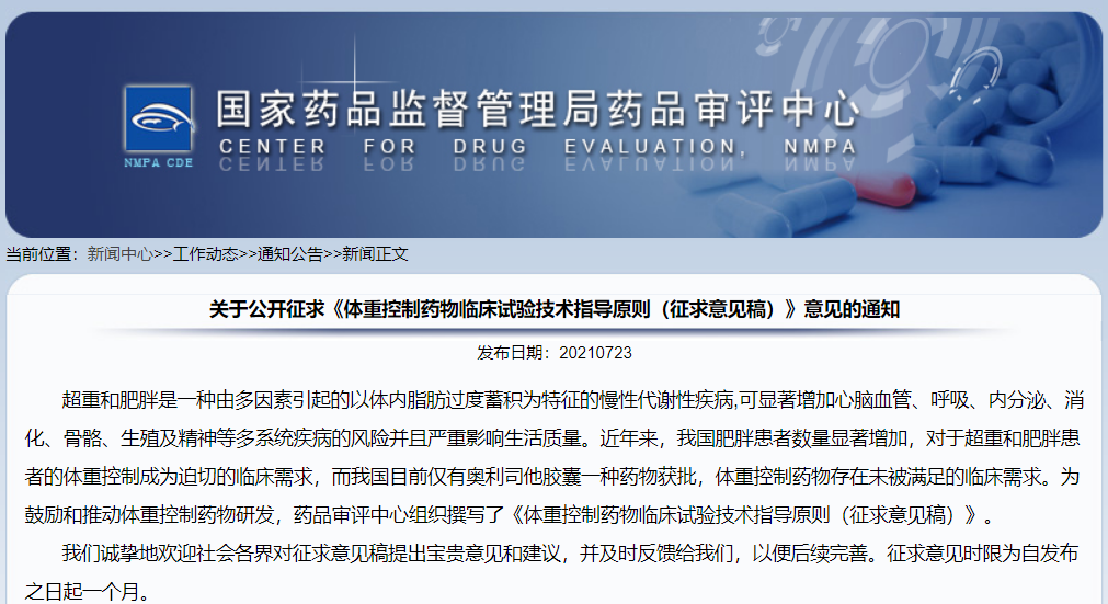 近年來國際上和我國體重控制藥物的研發(fā)逐年增多、成為研發(fā)活躍的治療領域,但目前國內(nèi)尚無體重控制藥物的臨床試驗指導原則,為鼓勵和推動體重控制藥物研發(fā),規(guī)范臨床研究設計和相關技術要求,CDE近期發(fā)布《體重控制藥物臨床試驗技術指導原則》(征求意見稿),供企業(yè)和臨床研究單位參考。
