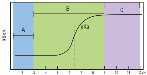 流動(dòng)相pH值一般選取pKa±2范圍之外,以保障化合物處于分子狀態(tài),減少電離,此狀態(tài)下化合物疏水性較強(qiáng),色譜柱保留時(shí)間較長(zhǎng),能獲得良好的峰型。