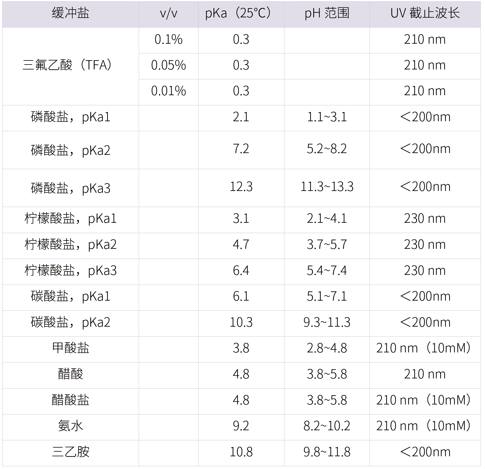 緩沖體系選擇的要求:能適當(dāng)控制離子化、與檢測(cè)器兼容性、緩沖鹽溶液與有機(jī)相的互溶性、流動(dòng)相的pH是否在色譜柱的安全范圍內(nèi)。
