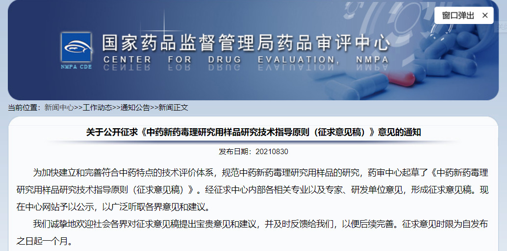 關(guān)于公開(kāi)征求《中藥新藥毒理研究用樣品研究技術(shù)指導(dǎo)原則(征求意見(jiàn)稿)》意見(jiàn)的通知