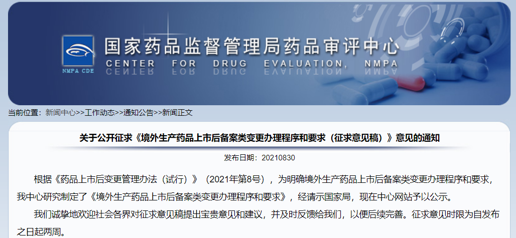 關(guān)于公開(kāi)征求《境外生產(chǎn)藥品上市后備案類變更辦理程序和要求(征求意見(jiàn)稿)》意見(jiàn)的通知
