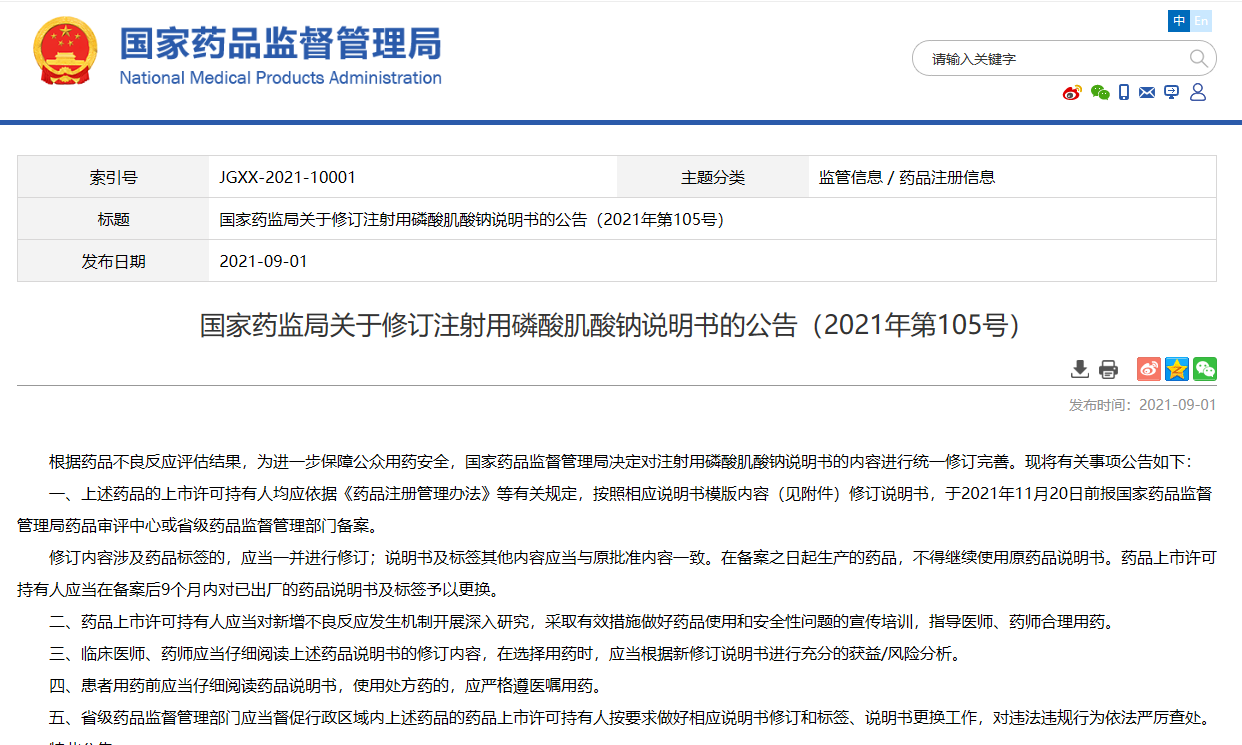 關(guān)于修訂注射用磷酸肌酸鈉說(shuō)明書(shū)的公告(2021年第105號(hào))