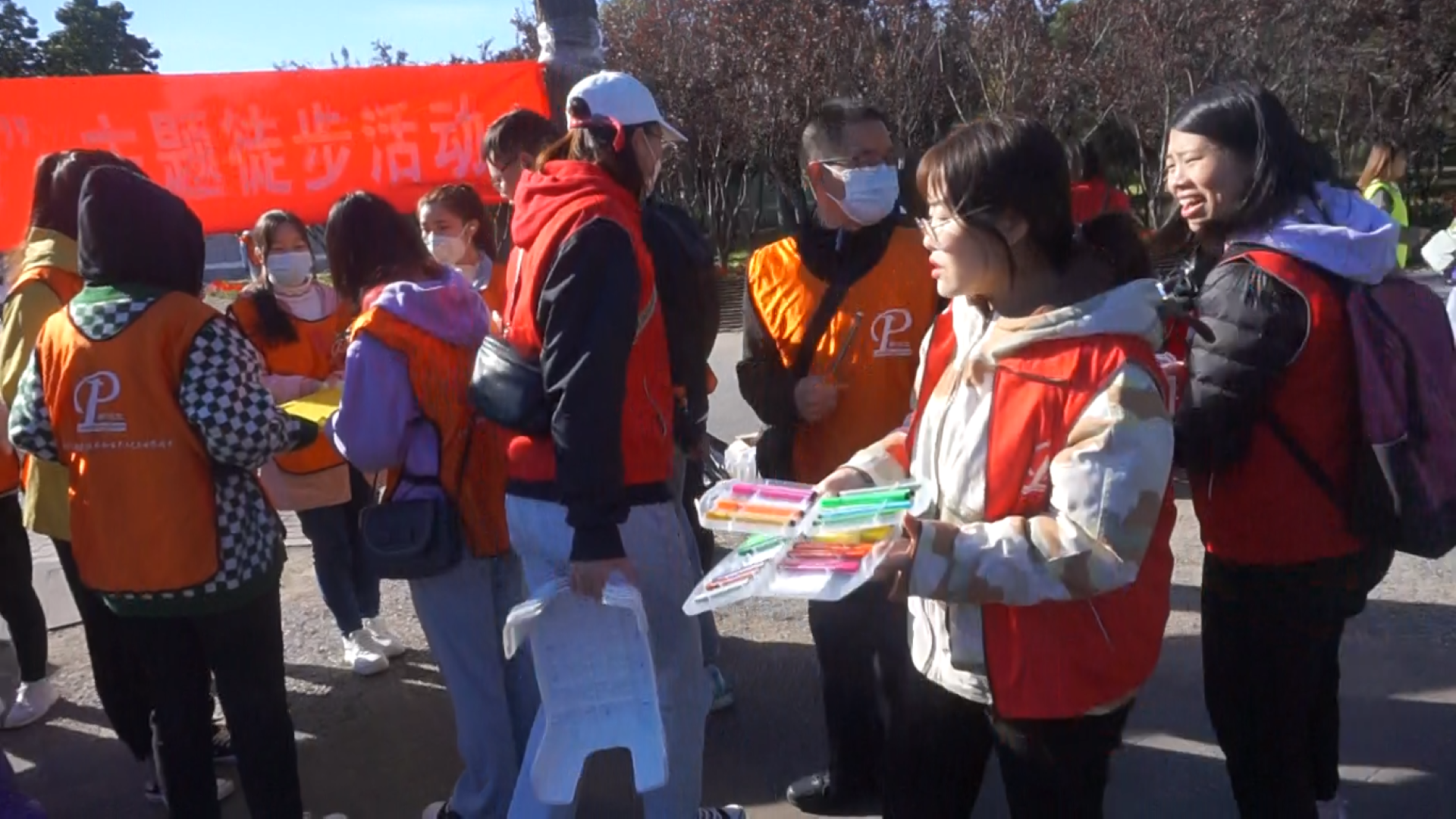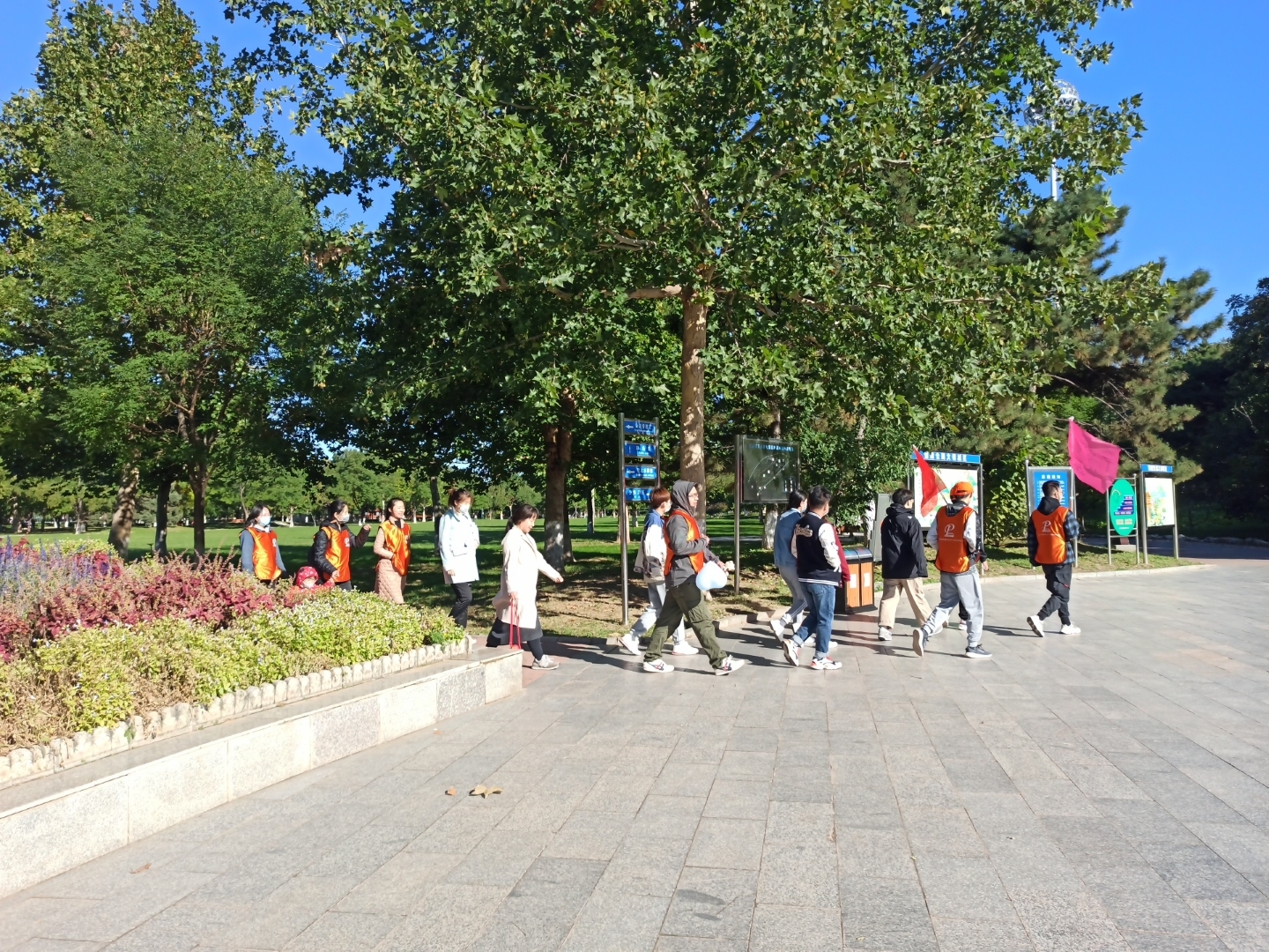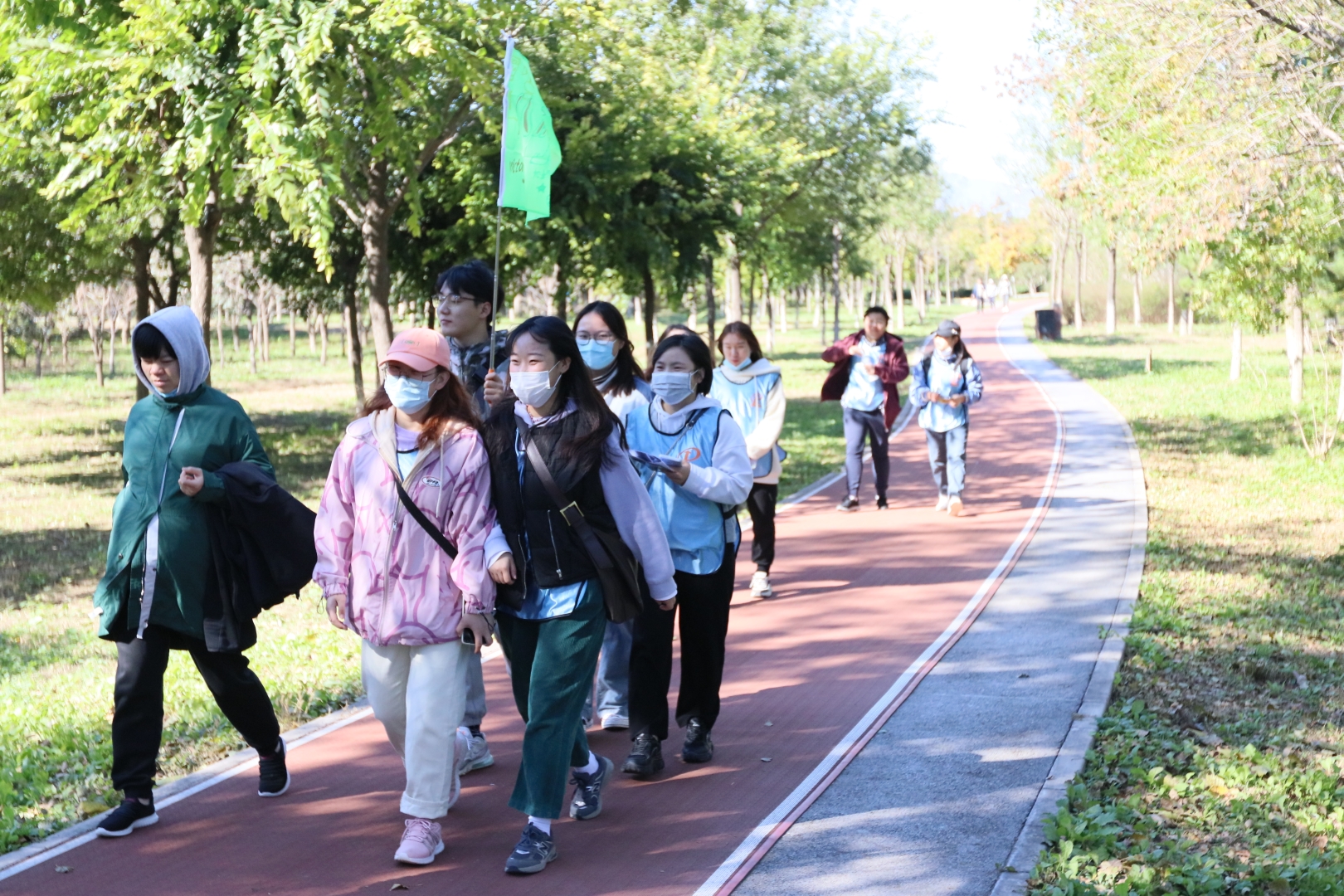 ▲各隊(duì)隊(duì)員高舉隊(duì)旗,耳聽秋風(fēng),腳踩落葉,有說(shuō)有笑,相伴同行