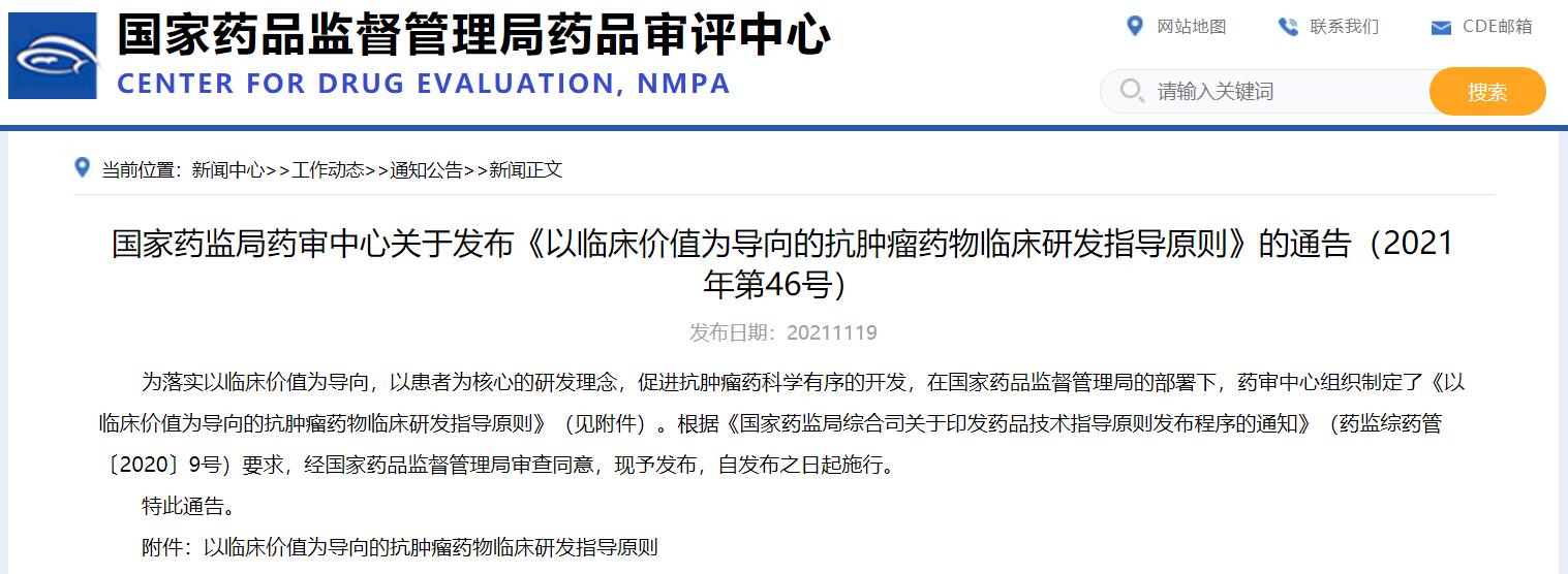 國(guó)家藥監(jiān)局藥審中心關(guān)于發(fā)布《以臨床價(jià)值為導(dǎo)向的抗腫瘤藥物臨床研發(fā)指導(dǎo)原則》的通告(2021年第46號(hào))