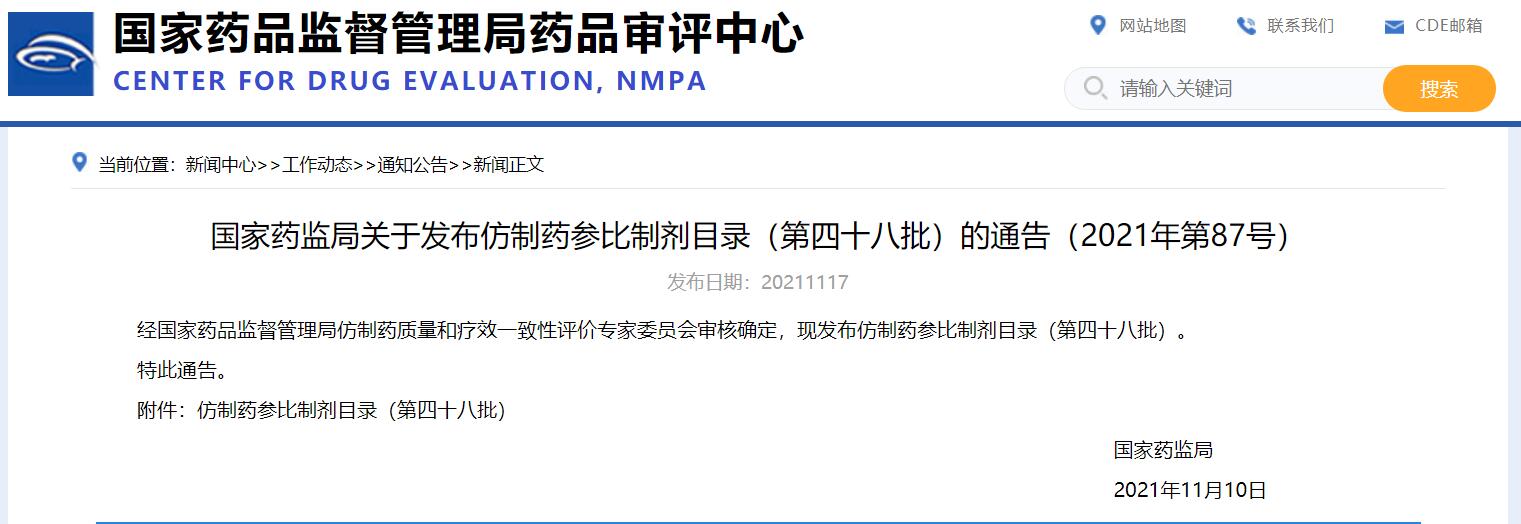國(guó)家藥監(jiān)局關(guān)于發(fā)布仿制藥參比制劑目錄(第四十八批)的通告(2021年第87號(hào))