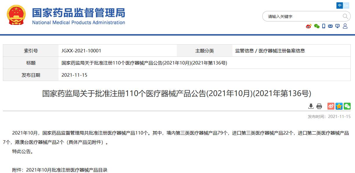 國(guó)家藥監(jiān)局關(guān)于批準(zhǔn)注冊(cè)110個(gè)醫(yī)療器械產(chǎn)品公告(2021年10月)(2021年第136號(hào))