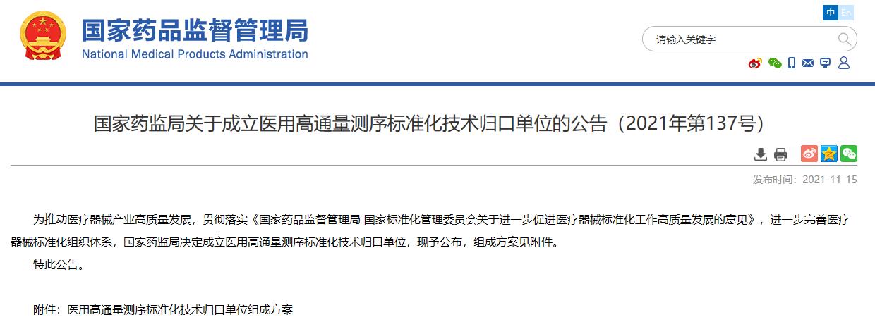 國(guó)家藥監(jiān)局關(guān)于成立醫(yī)用高通量測(cè)序標(biāo)準(zhǔn)化技術(shù)歸口單位的公告(2021年第137號(hào))