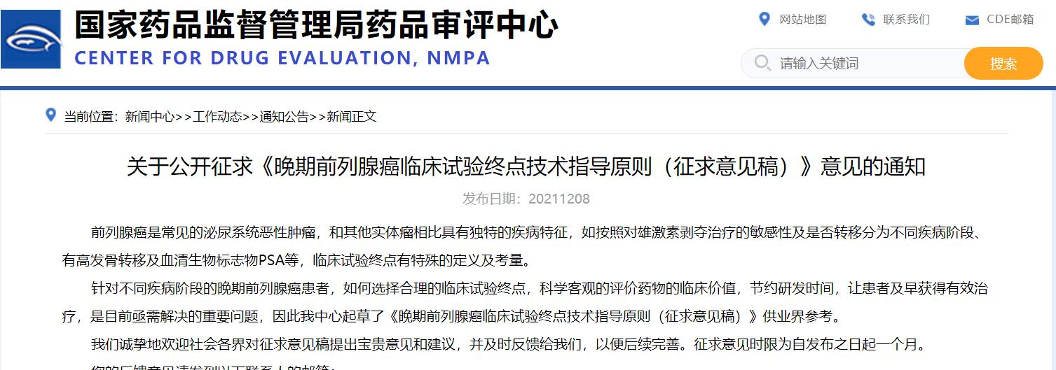 關(guān)于公開征求《晚期前列腺癌臨床試驗(yàn)終點(diǎn)技術(shù)指導(dǎo)原則(征求意見稿)》意見的通知