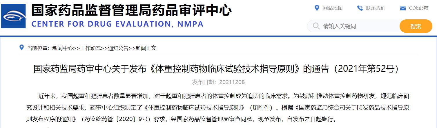 國(guó)家藥監(jiān)局藥審中心關(guān)于發(fā)布《體重控制藥物臨床試驗(yàn)技術(shù)指導(dǎo)原則》的通告(2021年第52號(hào))
