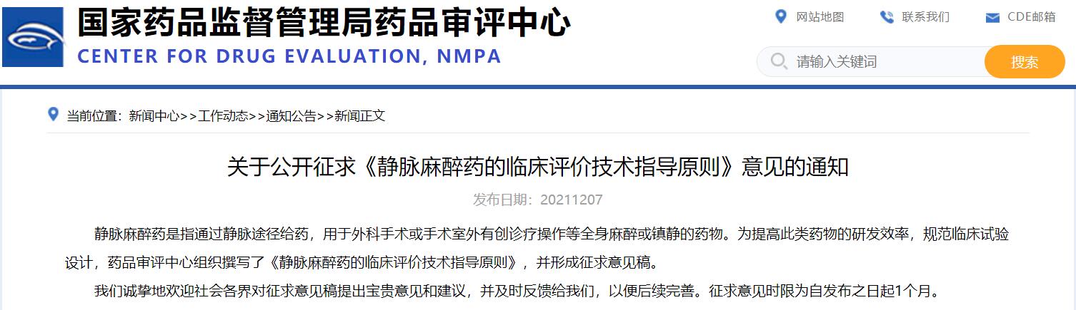 關(guān)于公開征求《靜脈麻醉藥的臨床評(píng)價(jià)技術(shù)指導(dǎo)原則》意見的通知