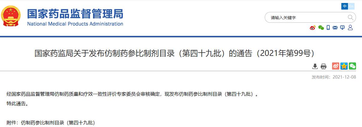 國(guó)家藥監(jiān)局關(guān)于發(fā)布仿制藥參比制劑目錄(第四十九批)的通告(2021年第99號(hào))