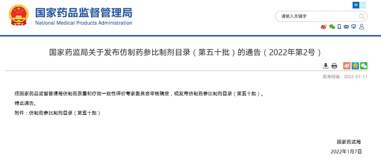 國家藥監(jiān)局關(guān)于發(fā)布仿制藥參比制劑目錄(第五十批)的通告(2022年第2號(hào))