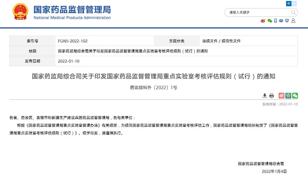 國家藥監(jiān)局綜合司關(guān)于印發(fā)國家藥品監(jiān)督管理局重點(diǎn)實(shí)驗(yàn)室考核評(píng)估規(guī)則(試行)