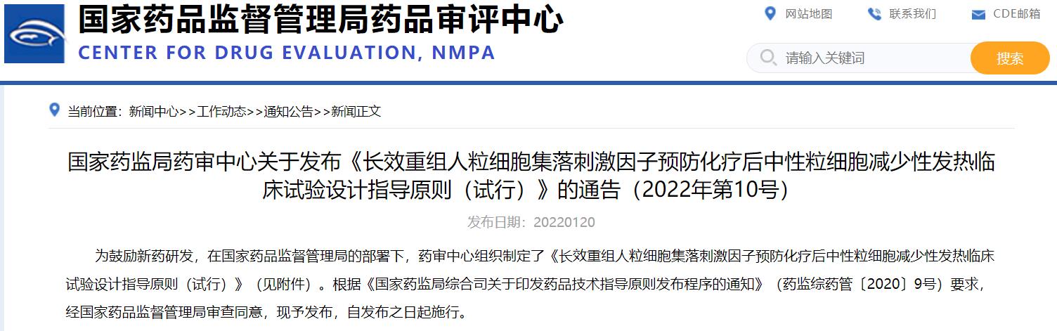 國家藥監(jiān)局藥審中心關于發(fā)布《長效重組人粒細胞集落刺激因子預防化療后中性粒細胞減少性發(fā)熱臨床試驗設計指導原則(試行)》的通告(2022年第10號)