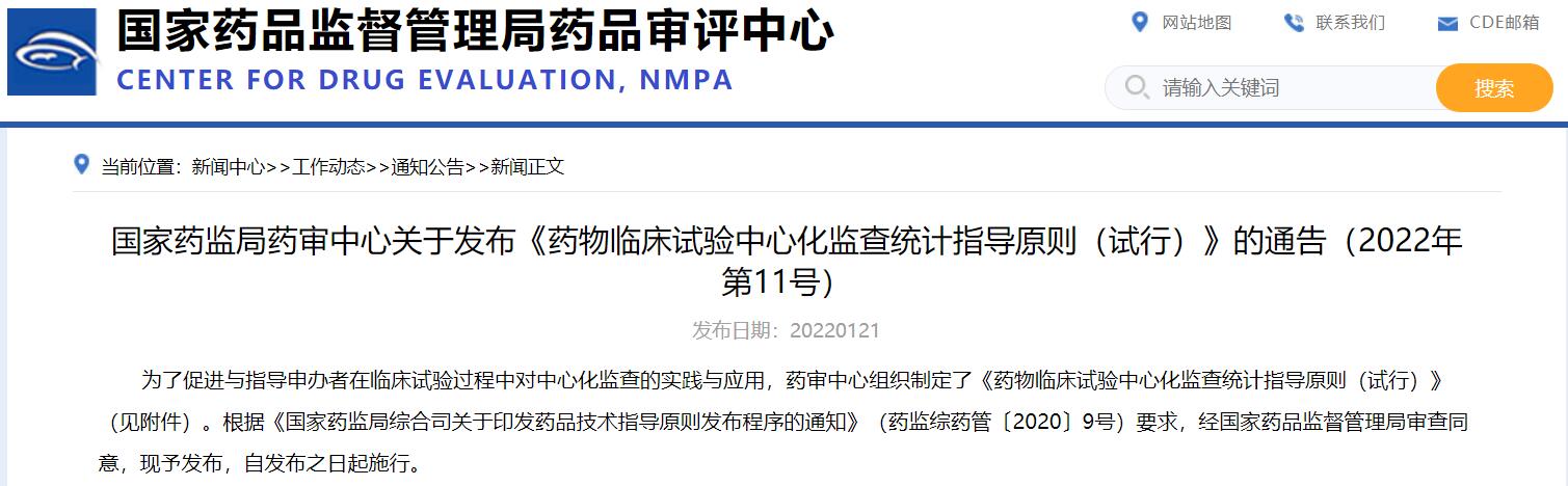國家藥監(jiān)局藥審中心關于發(fā)布《藥物臨床試驗中心化監(jiān)查統(tǒng)計指導原則(試行)》的通告(2022年第11號)