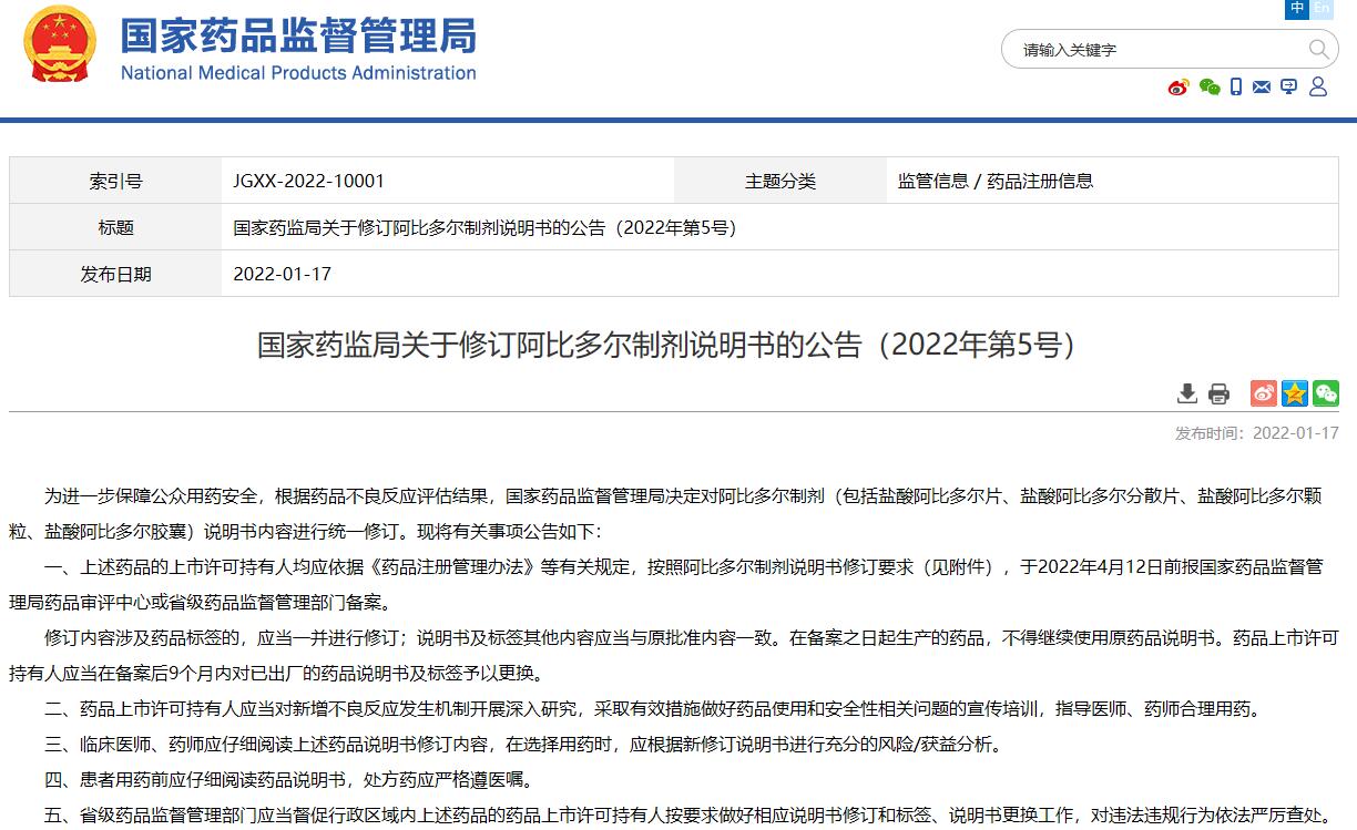 國家藥監(jiān)局關于修訂阿比多爾制劑說明書的公告(2022年第5號)