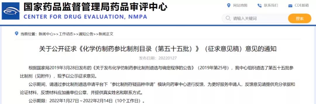 關(guān)于公開征求《化學(xué)仿制藥參比制劑目錄(第五十五批)》(征求意見稿)意見的通知