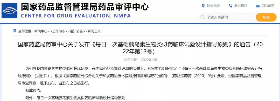 國家藥監(jiān)局藥審中心關(guān)于發(fā)布《每日一次基礎(chǔ)胰島素生物類似藥臨床試驗(yàn)設(shè)計指導(dǎo)原則》的通告(2022年第13號)