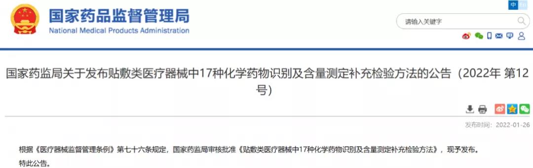 國家藥監(jiān)局關(guān)于發(fā)布貼敷類醫(yī)療器械中17種化學(xué)藥物識別及含量測定補(bǔ)充檢驗(yàn)方法的公告(2022年 第12號)