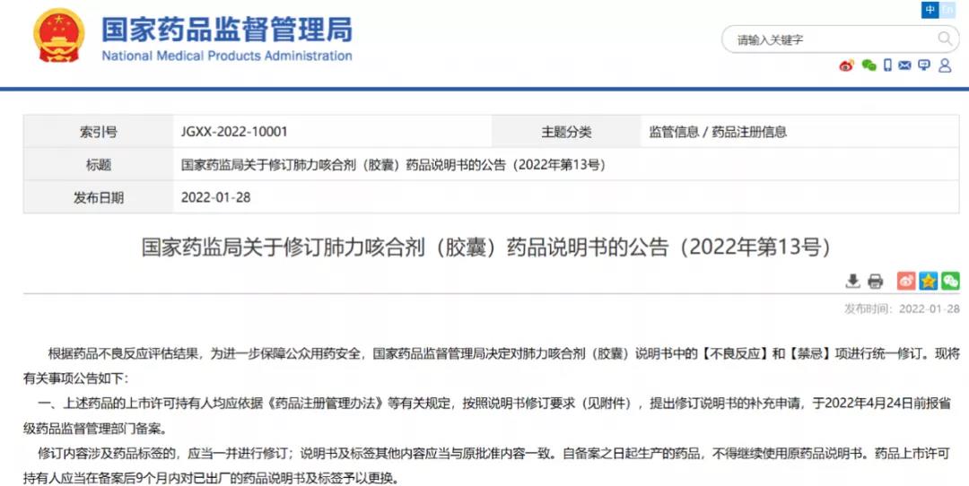 國家藥監(jiān)局關(guān)于修訂肺力咳合劑(膠囊)藥品說明書的公告(2022年第13號)