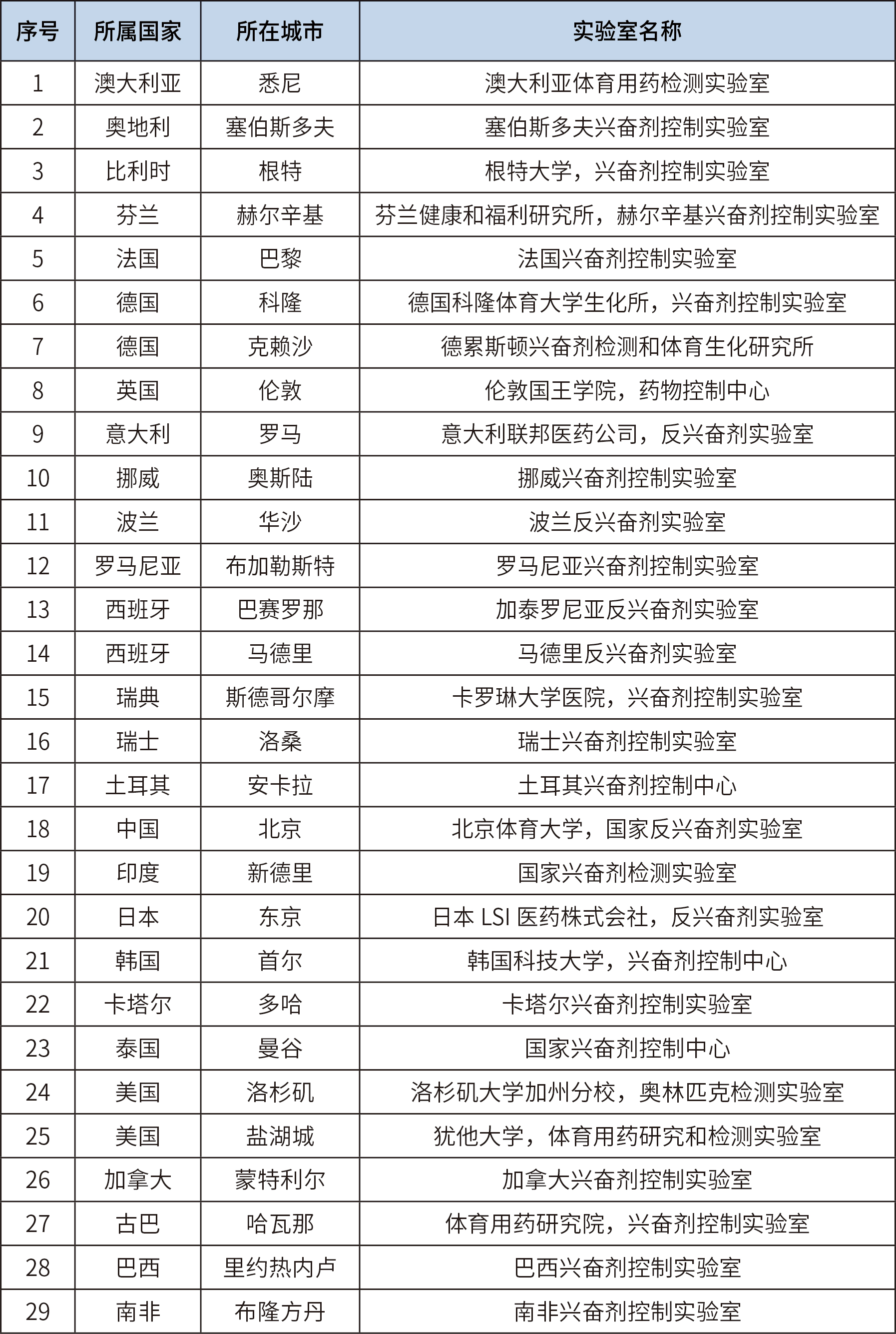 目前全世界共有興奮劑檢測實驗室29個,分布在五大洲,其中歐洲16個,亞洲6個,北美洲4個,大洋洲、南美洲和非洲各1個,詳見下表:
