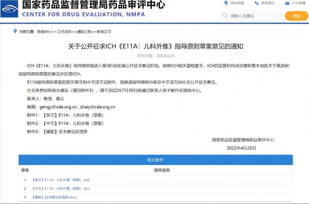 關于公開征求ICH《E11A:兒科外推》指導原則草案意見的通知