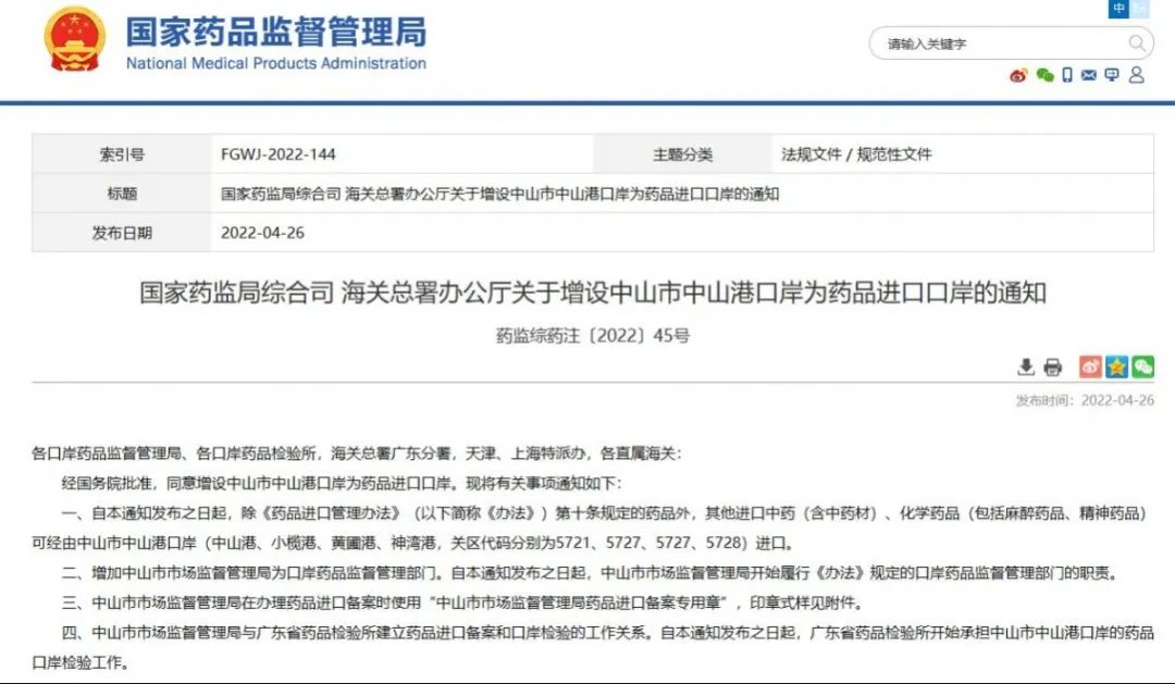 國家藥監(jiān)局綜合司 海關總署辦公廳關于增設中山市中山港口岸為藥品進口口岸的通知