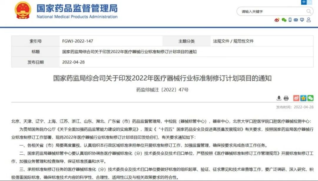 國家藥監(jiān)局綜合司關于印發(fā)2022年醫(yī)療器械行業(yè)標準制修訂計劃項目的通知
