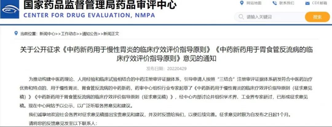 關于公開征求《中藥新藥用于慢性胃炎的臨床療效評價指導原則》《中藥新藥用于胃食管反流病的臨床療效評價指導原則》意見的通知