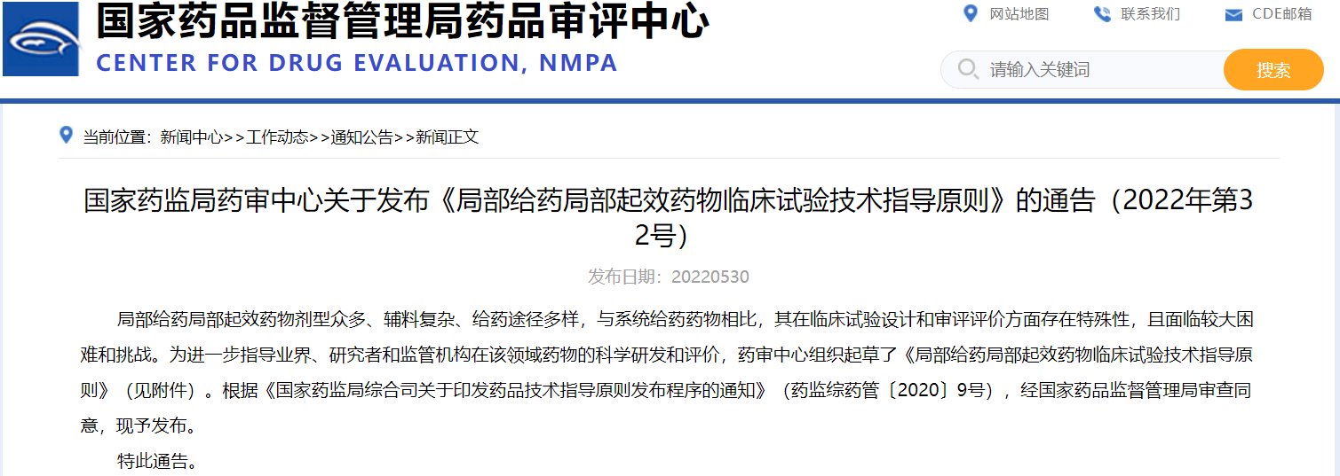 國家藥監(jiān)局藥審中心關于發(fā)布《局部給藥局部起效藥物臨床試驗技術指導原則》的通告(2022年第32號)