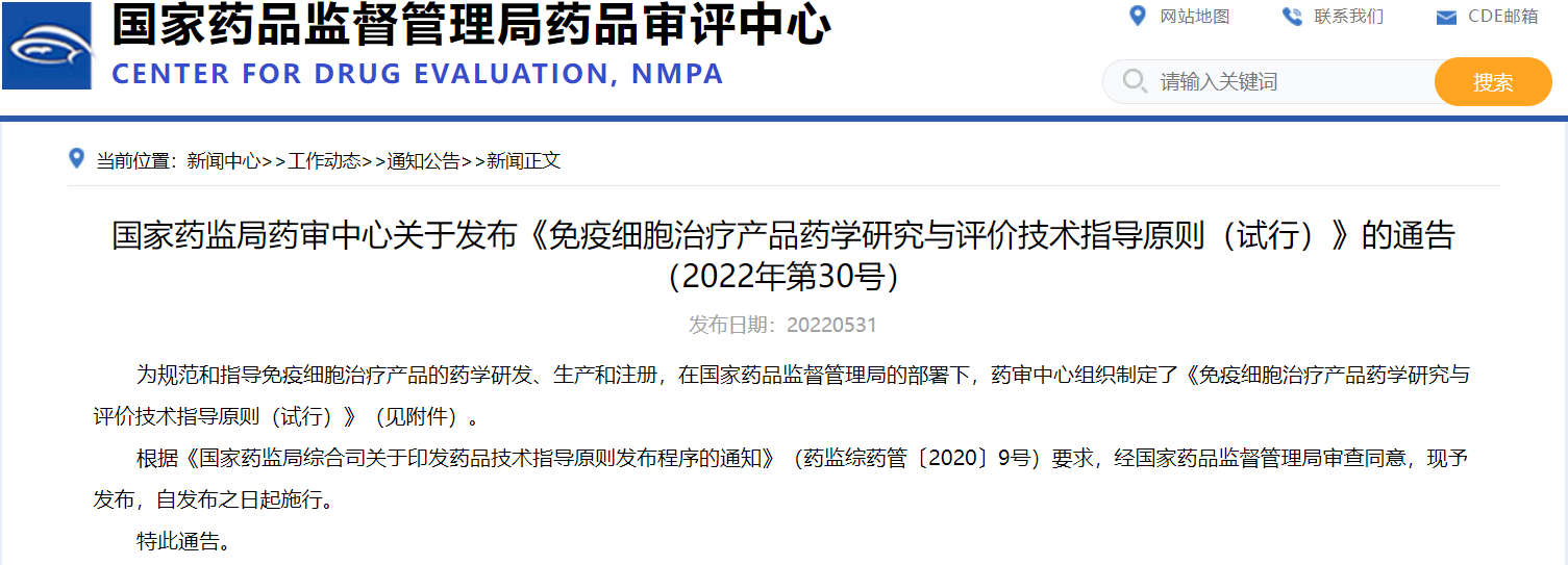 國家藥監(jiān)局藥審中心關于發(fā)布《免疫細胞治療產(chǎn)品藥學研究與評價技術指導原則(試行)》的通告(2022年第30號)