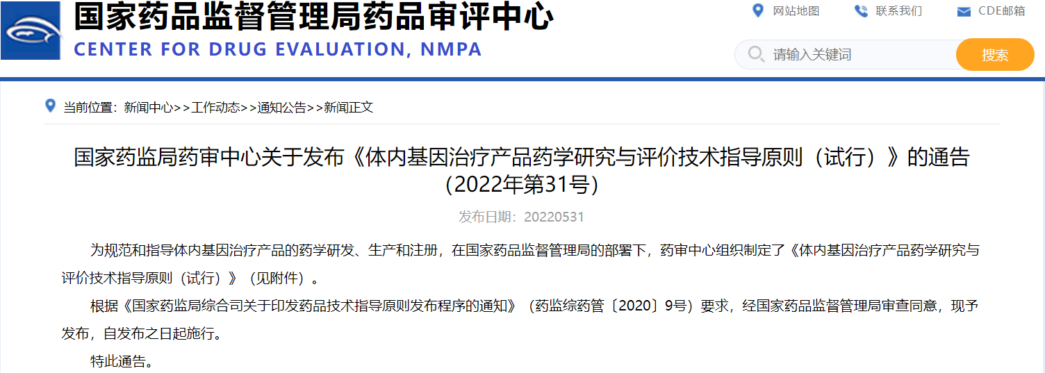 國家藥監(jiān)局藥審中心關于發(fā)布《體內(nèi)基因治療產(chǎn)品藥學研究與評價技術指導原則(試行)》的通告(2022年第31號)
