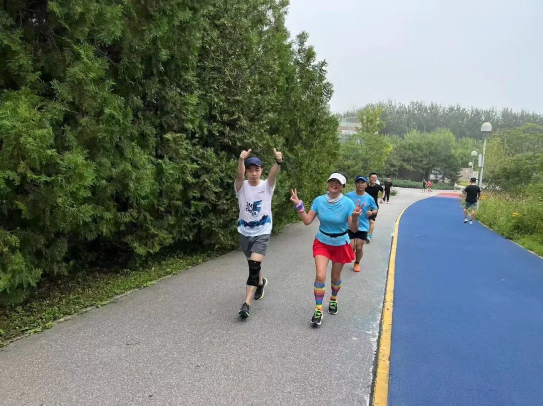 尹老師是北京馬拉松協(xié)會專業(yè)配速員,今年醫(yī)藥天團備戰(zhàn)期間,她與另外兩個專業(yè)老師在奧森帶領大家一起拉練?!敢驗橛械男』锇槭堑谝淮螀⒓覤MW越山向海,所以我們在北京奧森公園組織了兩次爬坡集訓。在這過程中,我們也分享了無傷完賽的諸多注意事項?!箯呐芮皽蕚浠顒拥脚芎罄熘笇В趥滟愑柧氝^程中,尹小紅老師將自己在北馬協(xié)會中學到的理念,毫無保留地分享給參賽團隊。