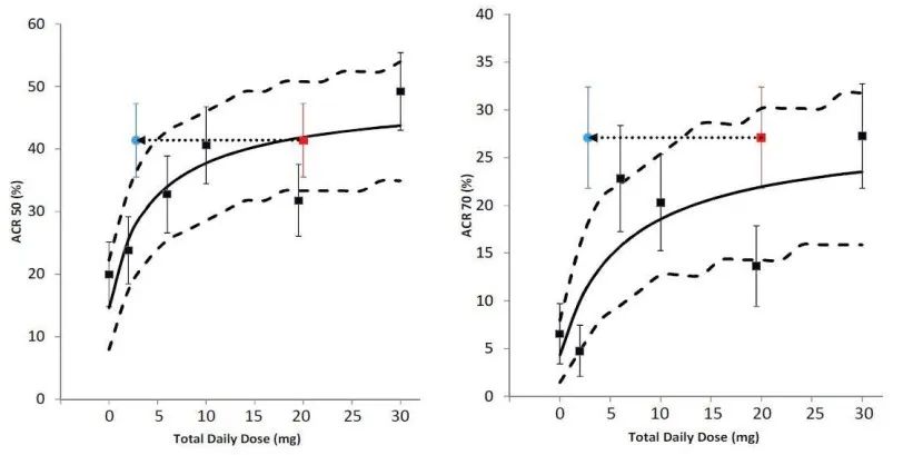 本品種PD研究中以美國風濕病學會(ACR)規(guī)定觀指標,若患者達到20%、50%或70%的緩解,即達到ACR20、ACR50或ACR70緩解。