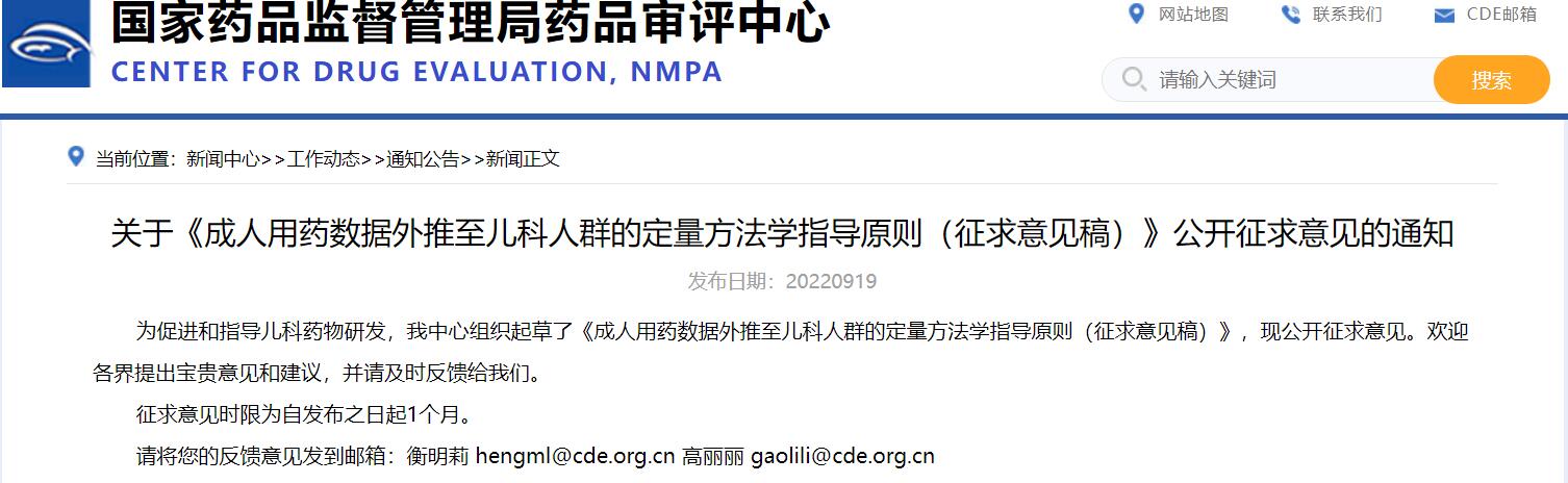 關(guān)于《成人用藥數(shù)據(jù)外推至兒科人群的定量方法學(xué)指導(dǎo)原則(征求意見稿)》公開征求意見的通知