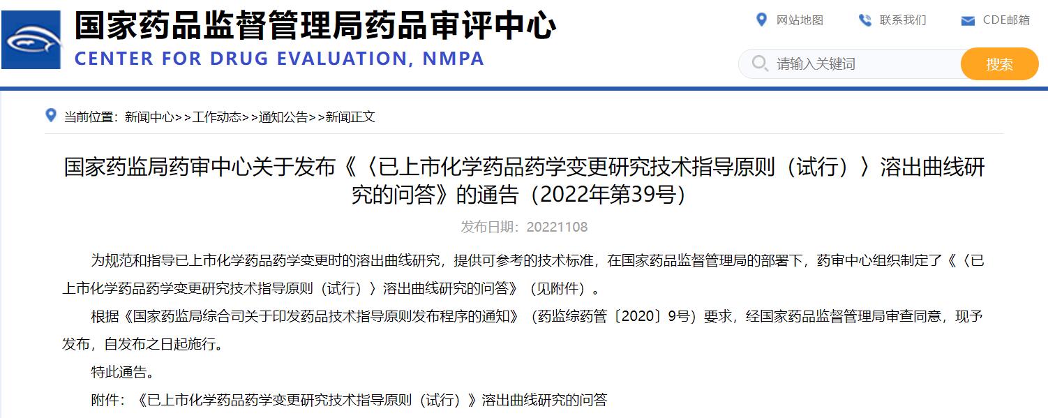 國家藥監(jiān)局藥審中心關(guān)于發(fā)布《〈已上市化學(xué)藥品藥學(xué)變更研究技術(shù)指導(dǎo)原則(試行)〉溶出曲線研究的問答》的通告(2022年第39號(hào))