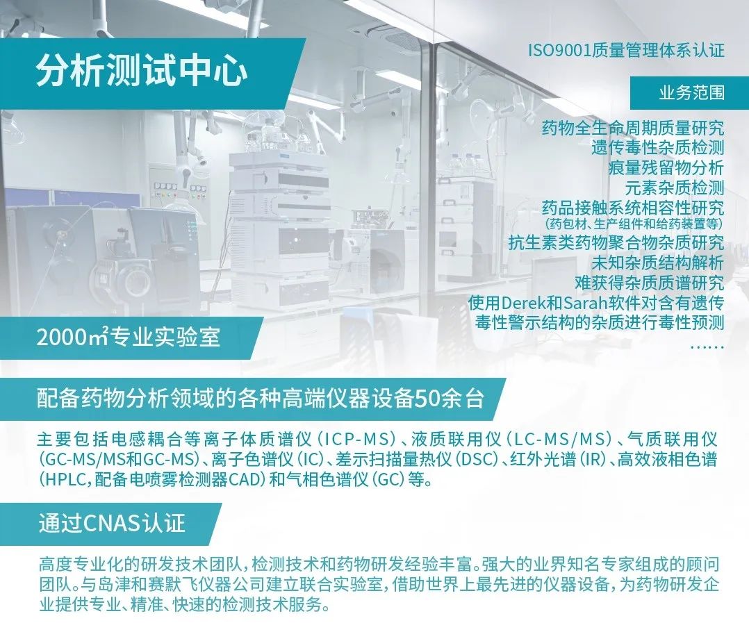 北京新領先醫(yī)藥科技發(fā)展有限公司分析測試平臺成立于2014年,2019年正式更名為分析測試中心(以下簡稱中心)并開始向國內外藥企提供檢測技術服務。本中心有2000m2的專業(yè)實驗室,高度專業(yè)化的研發(fā)技術團隊,團隊成員100人,其中博士5名,碩士以上學歷占80%以上。配備了藥物分析領域高端儀器設備HPLC、UPLC、GC/GC-MS、LC-MS、ICP-MS、TGA、溶出儀等50余臺,并具有安全、準確、可靠、可追溯的數據和結果管理體系。