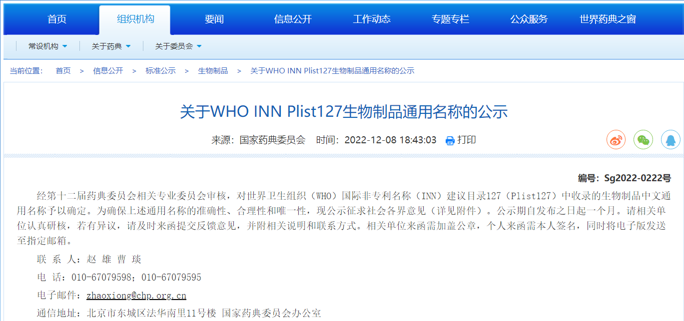 關(guān)于WHO INN Plist127生物制品通用名稱的公示