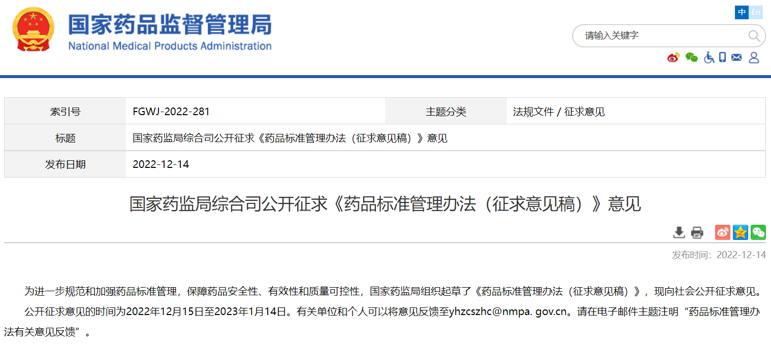 國家藥監(jiān)局綜合司公開征求《藥品標(biāo)準(zhǔn)管理辦法(征求意見稿)》意見