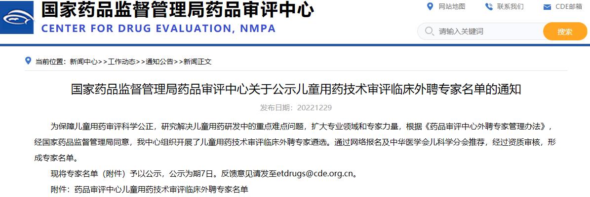 國家藥品監(jiān)督管理局藥品審評中心關(guān)于公示兒童用藥技術(shù)審評臨床外聘專家名單的通知